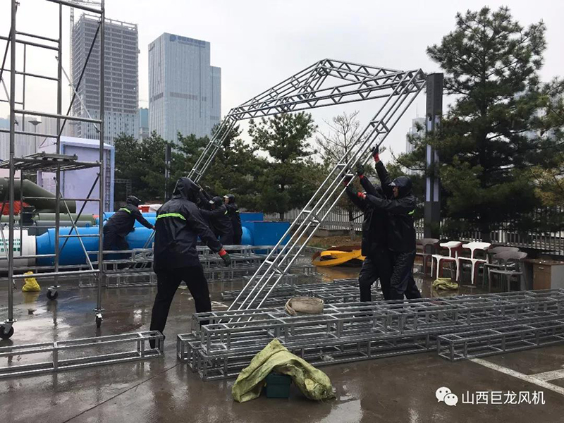 常言道:貴人出門遇風雨,黃金雨露灑人間。在抵達太原展會區,天空雨水綿綿,我公司參展的將士們冒雨布展,雖然雨水淋濕了衣衫,但絲毫沒有影響到大家爭分奪秒搭建展架的干勁,心里只有一個信念,那就是:必須全力以赴確保參展圓滿成功!