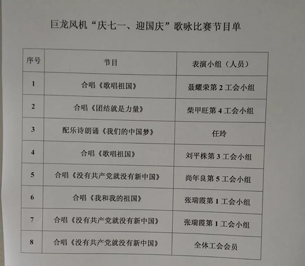 巨龍風機“慶七一、迎國慶”歌詠比賽,得到了公司領導的大力支持,公司各部門在百忙中組織人員積極參加活動,為活動圓滿成功舉辦增添助力!