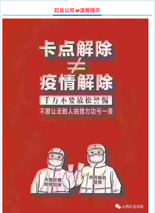 上一篇:《山西巨龍?風機有限公司》成立“疫情防控領導小組”為下一步防控工作打下良好基礎!